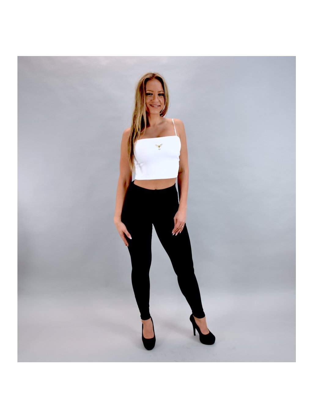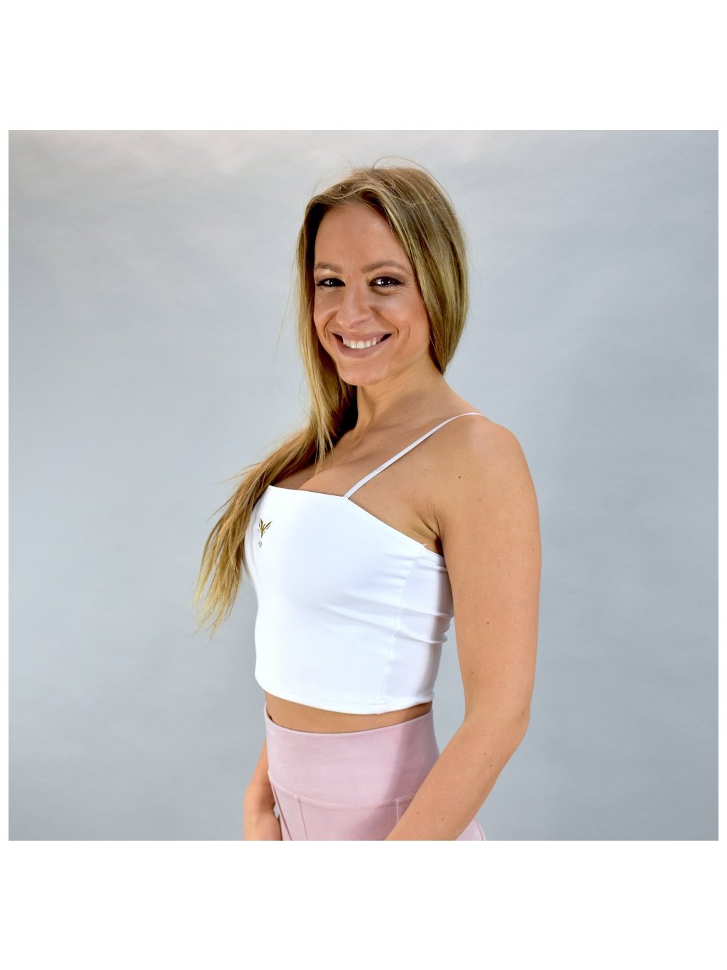 Zlaté logo ve předu dodává topu nádech luxusu. Jelikož materiál je pružný, tento crop top je vhodný nejen jako doplněk outfitu do města, ale dá se využít i ke cvičení, perfektně odvádí pot a vy se nebudete cítit nepříjemně ani po větší námaze ve fitku.